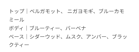 ラストノート(1時間以上) | ムスク、バージニアシダー、蜜蝋、バニラ |